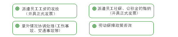 公司的優(yōu)勢(shì):提供社會(huì)化后勤服務(wù),包括員工宿舍籌建管理、班車(chē)接送、負(fù)責(zé)工傷過(guò)程中的理賠、申報(bào)、慰問(wèn)過(guò)程、一些節(jié)日會(huì)發(fā)放禮品等。
